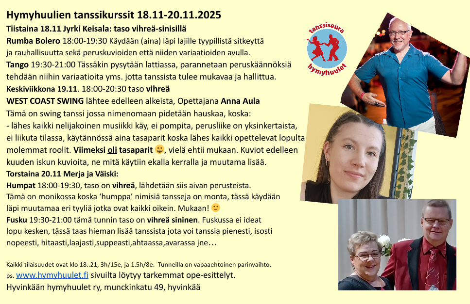Seuratanssiharrastuksen aloittaminen on helppoa ja hauskaa. Alkuun pääset tulemalla tutustumaan toimintaan Hymyhuulten harjoituksiin. Mukaan tarvitset mukavat kengän, juomapullon sekä reipasta, iloista mieltä.