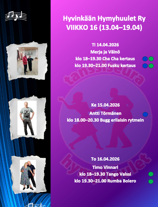 Seuratanssiharrastuksen aloittaminen on helppoa ja hauskaa. Alkuun pääset tulemalla tutustumaan toimintaan Hymyhuulten harjoituksiin. Mukaan tarvitset mukavat kengän, juomapullon sekä reipasta, iloista mieltä.