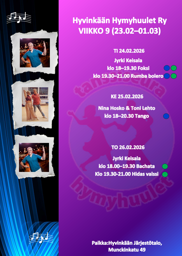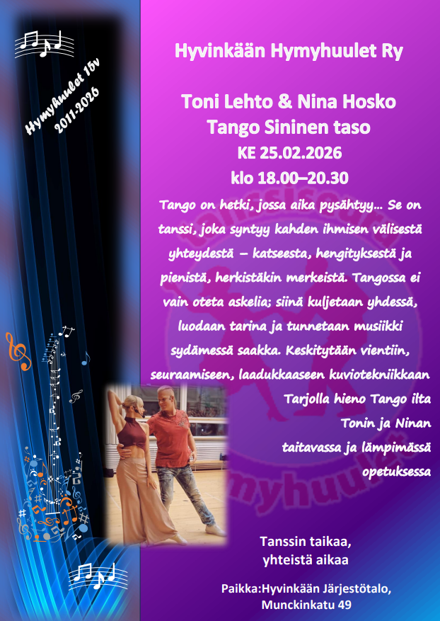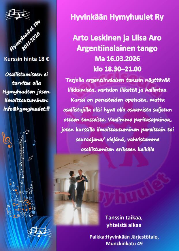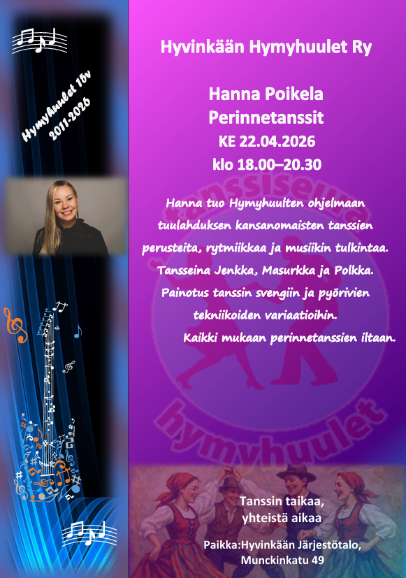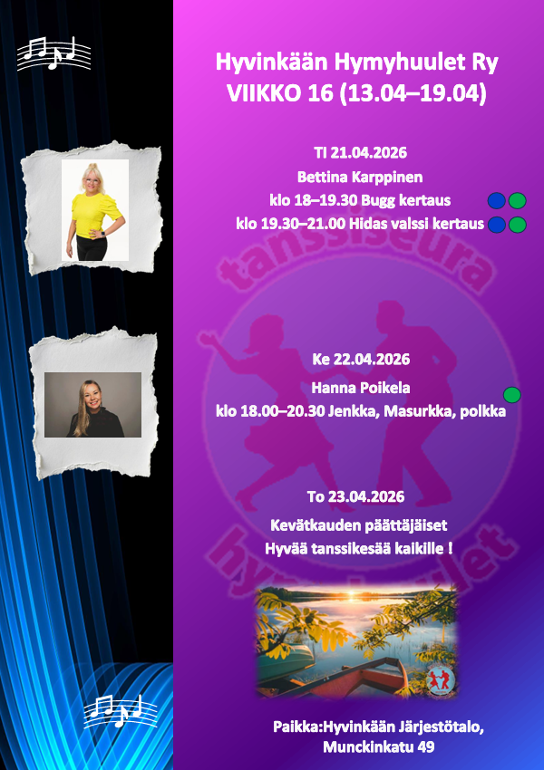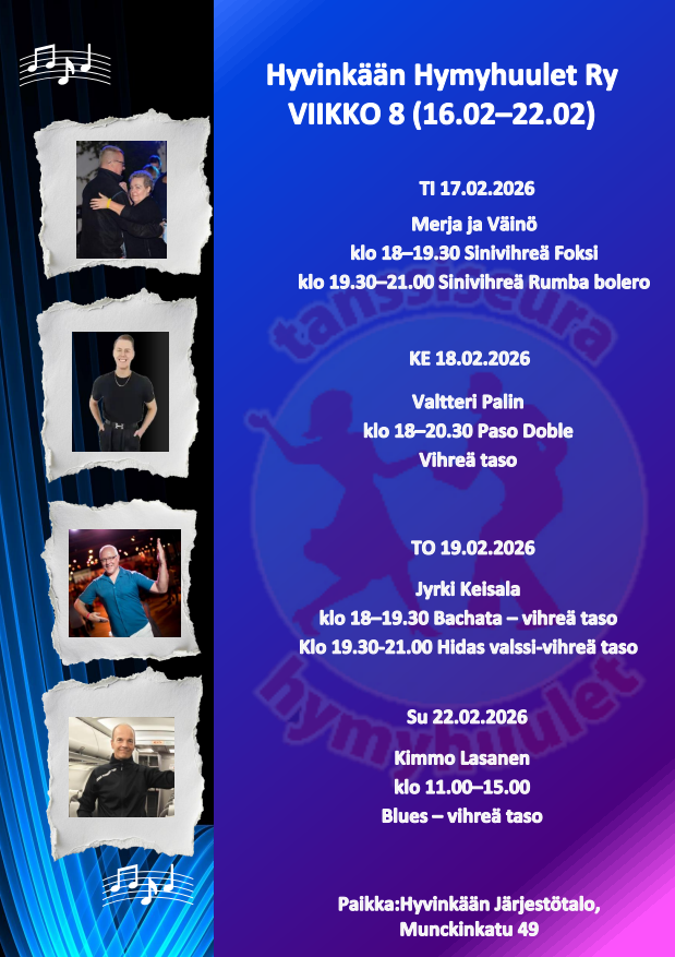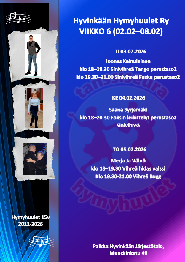 Seuratanssiharrastuksen aloittaminen on helppoa ja hauskaa. Alkuun pääset tulemalla tutustumaan toimintaan Hymyhuulten harjoituksiin. Mukaan tarvitset mukavat kengän, juomapullon sekä reipasta, iloista mieltä.