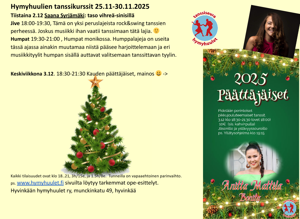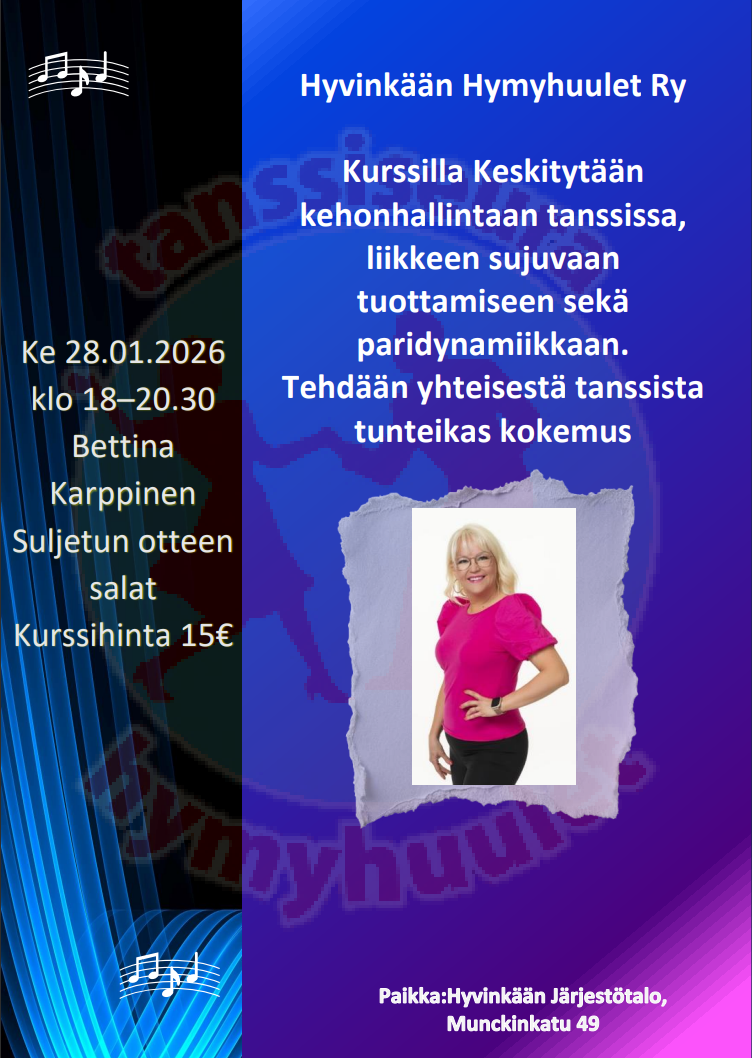 Tarkemmin tanssilajeista seuran sosiaalisesta mediasta FB:sta https://m.facebook.com/tanssiseura.hyvinkaa/ , IG:sta sekä seuran jäsenille lähetetettävissä jäsenkirjeistä.