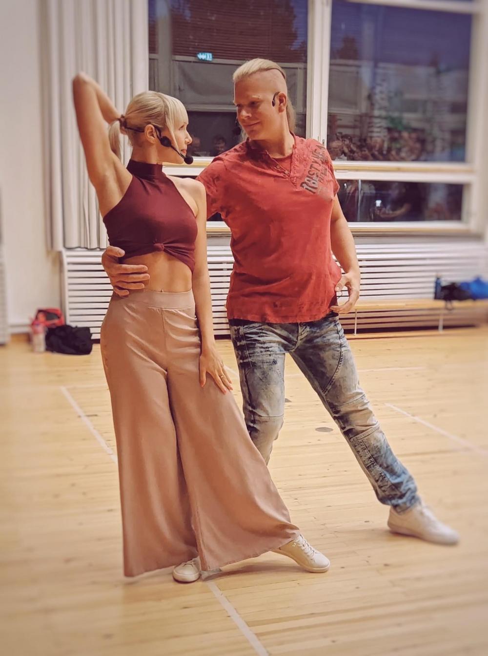 Olen tanssinopettaja vuodelta 2022 ja kokemusta n.30 vuotta josta 20 on opetettu ja ohjattu. Minulle opetuksessa tärkeää on kehon ja musiikin käyttö. Opettamisessa pyrin välttämään liian ryppyistä otsaa ja vaikka opetukseen suhtaudun intohimoisesti sekä tosissani niin tunneilla pitää myös olla rento tekemisen meininki. Kysymyksiin saa vastaukset ja tunnit saavat olla interaktiivisia, ei vain yhteen suuntaan paasaavaa. Kuvassa olen näyttöparini Anita Myllymäen kanssa